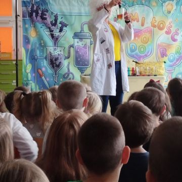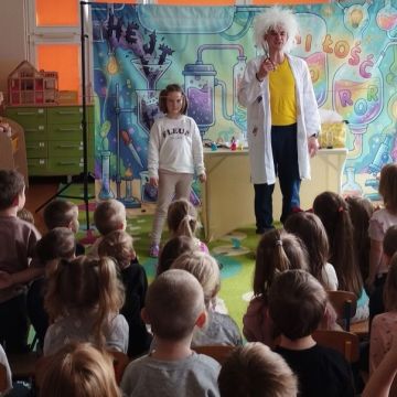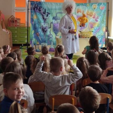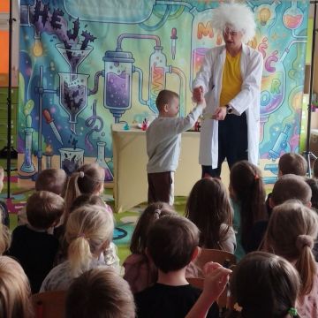 Dnia 17 marca 2026 roku nasze przedszkolaki odwiedził teatrzyk z Firmy MAT- Art. Przedstawienie pt. „Laboratorium Dobrego Słowa” miało na celu pokazanie, jak wielką moc mają słowa – zarówno te dobre, jak i złe. Aktor wcielił się w rolę naukowca prowadzącego symboliczne eksperymenty w „laboratorium”, w którym badał wpływ słów na drugiego człowieka.
